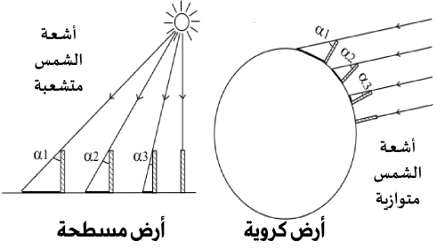 نموذج الأرض الكروية يشترط: أن تكون الشمس كبيرة، أن تكون الشمس بعيدة، أن تكون أشعة الشمس متوازية.