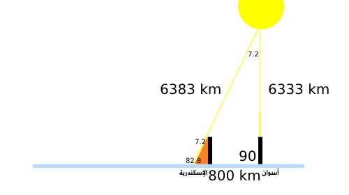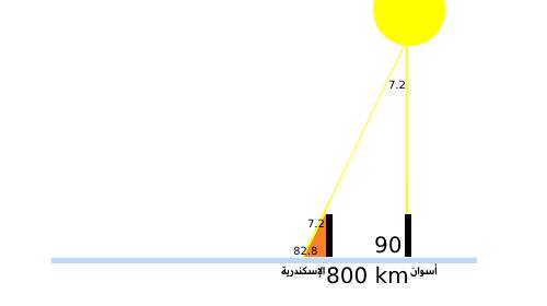المحيط الكلي للأرض يكون مساويًا لحاصل قسمة 360/7.2 مضروبًا في المسافة بين المدينتين 800 كيلومتر، وينتج من هذه الحسابات أن محيط الأرض يبلغ 40,000 كيلو متر (1).