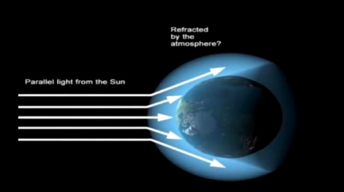 حتى أن المؤمنين بنظرية كروية الأرض لا يمكنهم إنكار ذلك، بل يقولون إن أشعة الشمس متوازية، لكنها عندما تصطدم بالغلاف الجوي عندها تتباعد، حسنًا إن آمنتم بأن أشعة الشمس تنزل على الأرض متفرقة بسبب الغلاف الجوي فيجب أن تؤمنوا أن تجارب وحسابات إراتوستينس والبيروني خاطئة تمامًا، وذلك لأن حساباتهم قائمة على افتراض أن أشعة الشمس متوازية!