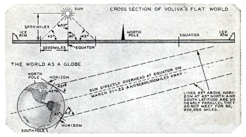 يمكن تفسير الظاهرة بكل بساطة على نموذج الأرض المسطحة؛ فالشمس صغيرة وقريبة وتدور في فلكها إلى أن تتعامد بزاوية 90 درجة فوق مدينة أسوان في تاريخ 21 يونيو، مما يعني انعدام الظِل فيها وقت الظهيرة، ولأن أشعة الشمس مُتباعدة؛ فإن الأشعة تسقط على مدينة الإسكندرية بزاوية 7.2 درجة.