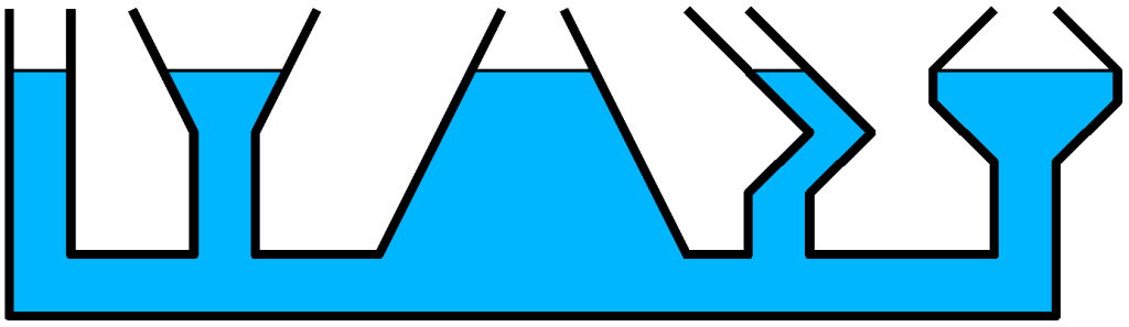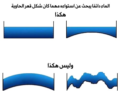 الماء يبحث عن استواءه (water seeks its own level) بحيث أنه لا يهم شكل قعر الحاوية التي يكون فيها الماء: مستوي، مقعر، محدب أو به تضاريس، دائمًا ما سيكون سطح الماء مستويًا.