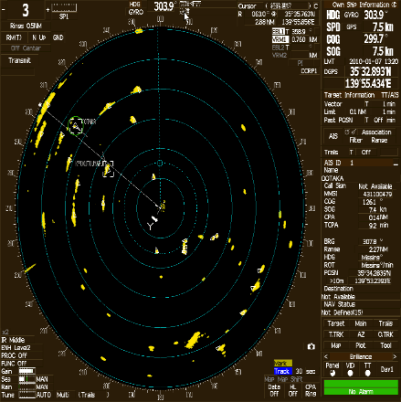 تمتلك السفن التجارية ذات الرحلات الدوّلية نوعين من الرادار، النوع الأول قريب المدى (x-band) والثاني بعيد المدى (s-band).