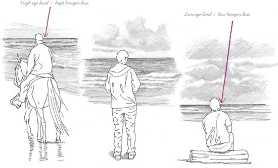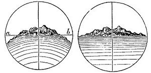 لو أن راصدًا طوله 170 سم ويقف على مستوى سطح البحر؛ فإنه سيرى خط الأفق بعينيه المجردتين على بُعد 5 كم تقريبًا، وكلما زاد ارتفاعه عن سطح الأرض سيرتفع خط الأفق إلى مستوى عينيه، بذلك سيتوسع مجال رؤيته، وسيستطيع الرؤية لمسافات أبعد، وسيبقى خط الأفق مستويًا من غير انحناء.
