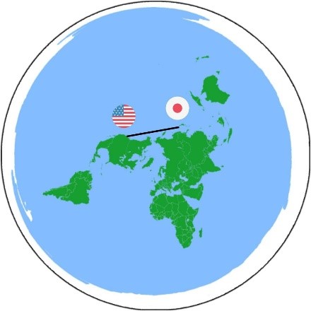 وجواب هذا السؤال هو مرة أخرى الاعتقاد الخاطئ للكروي بأن إسقاط ميركاتور هو خريطة الأرض المسطحة! وكل ما عليه فعله هو الاطلاع على خريطة الأرض المسطحة الفعلية والبحث عن اليابان والولايات المتحدة الأمريكية ويرسم خط مستقيم بينهما.