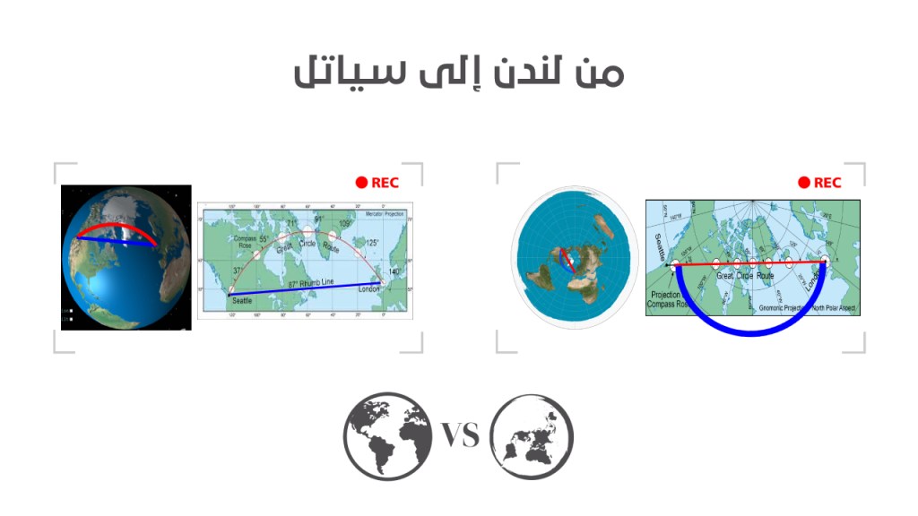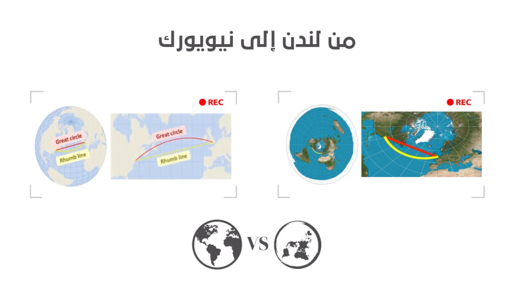 الاتجاه الأقصر على خريطة الأرض المسطحة يظهر بشكل مسار مستقيم بينما على إسقاط مركاتور يظهر بشكل مسار نصف دائري.